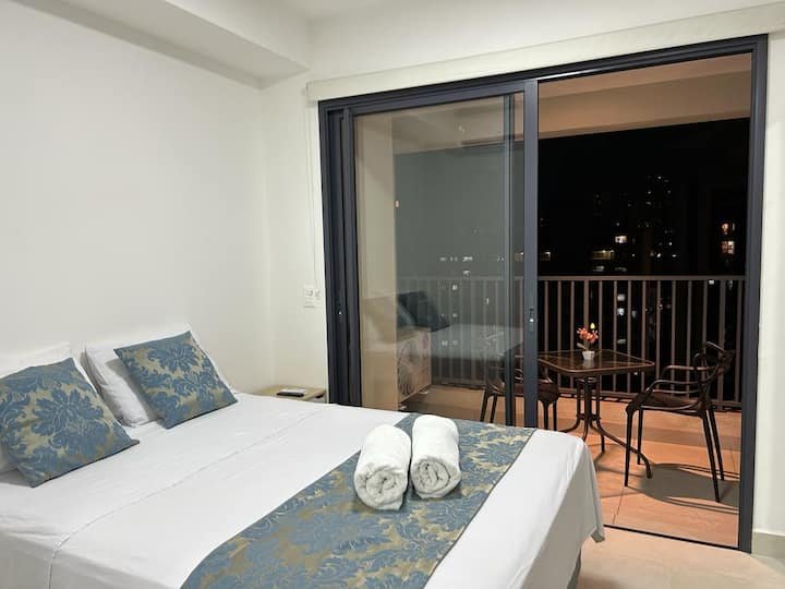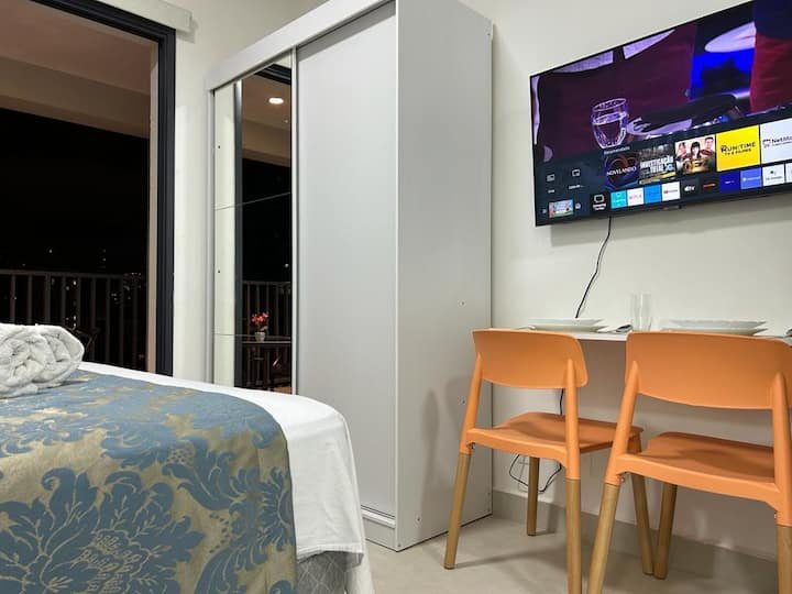 Com um design moderno e funcional, o studio apresenta uma cozinha equipada, banheiro completo e sala de estar integrada ao dormitório, tornando o espaço ainda mais aconchegante e convidativo. Além disso, as grandes janelas garantem uma ótima iluminação natural e a vista espetacular da cidade.
